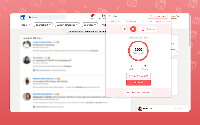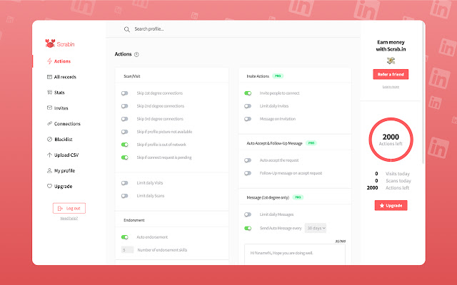 使用此工具,您将能够自动化您的社交网络任务,您可以访问个人资料,向他们发送直接消息或自动认可他们的技能