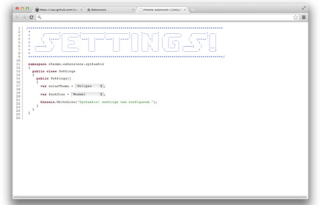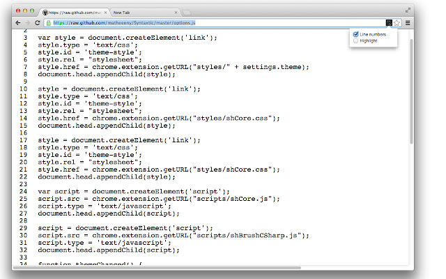 语法!是一个 chrome 扩展,用于在 Chrome 中打开的源文件上突出显示语法。此扩展主要用于查看托管在 Web 可访问版本控制系统中的文件,该系统本身不提供突出显示,但使用肯定不会就此结束。