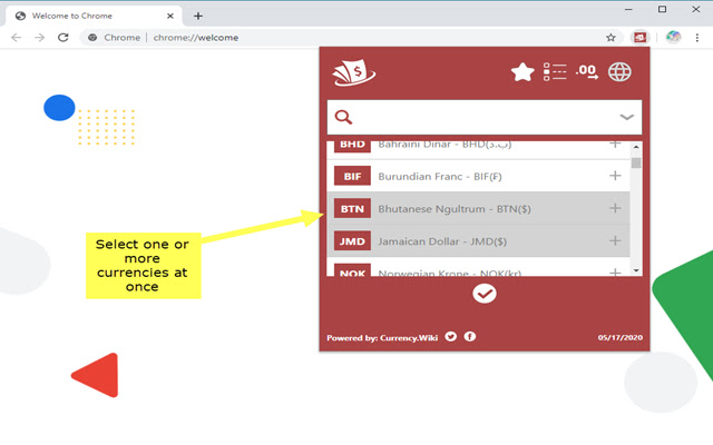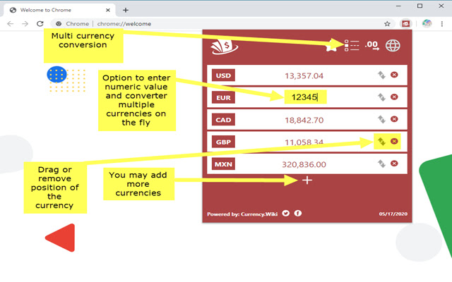 此货币转换器具有高度可定制性,可让您选择要在其间进行切换的首选货币。当您单击多货币转换器图标时,它将引导您到USD和EUR,因为这些是设置的默认值。您可以通过单击下面的加号按钮或拖动按钮自定义这些货币,以插入和删除您可能感兴趣的任何其他货币。该工具将自动保存您所做的任何更改,并且每当您打开浏览器时,它将恢复它们到以前的