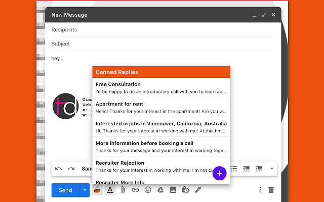 罐头回复是一种生产力工具,可让您更快速、更轻松地发送您经常发送的消息。使用预设回复创建一组常用的文本片段,并在 Gmail 内或从上下文菜单和浏览器弹出窗口轻松访问这些片段。