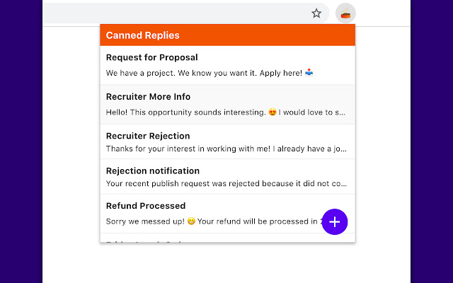 浏览器栏弹出窗口:Canned Replies 为所有其他用例提供了一个来自浏览器栏的弹出窗口。使用弹出窗口将代码片段复制到剪贴板。如果网站不支持本机上下文菜单,或者您想将消息粘贴到外部应用程序中,这将非常有用。