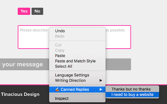 上下文菜单:通过上下文菜单插入文本片段。只需右键单击(或控制单击)任何可编辑字段,然后单击所需的预设回复以插入它。