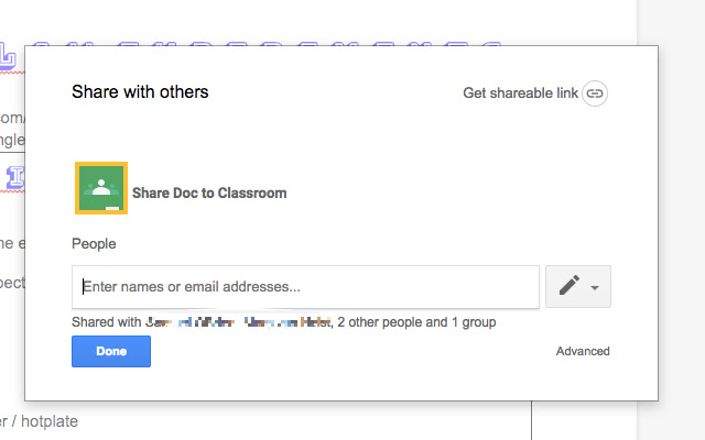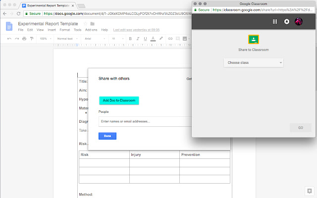 该按钮会打开一个新窗口,该窗口接受 Doc URL 并将其提供给 Classroom (https://classroom.google.com/share?url=...),所有这些都在您的计算机上。