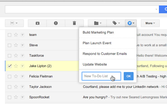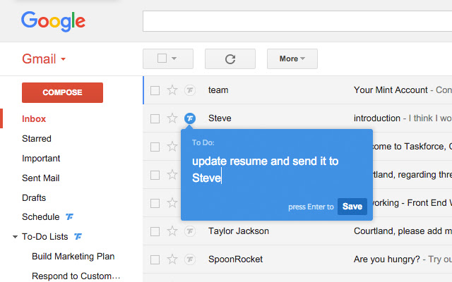 Taskforce 使您能够控制收件箱。您无需离开 Gmail,即可将电子邮件转换为任务、创建和整理待办事项列表以及与同事共享待办事项列表。您将节省时间,保持井井有条,并以前所未有的速度完成更多工作。