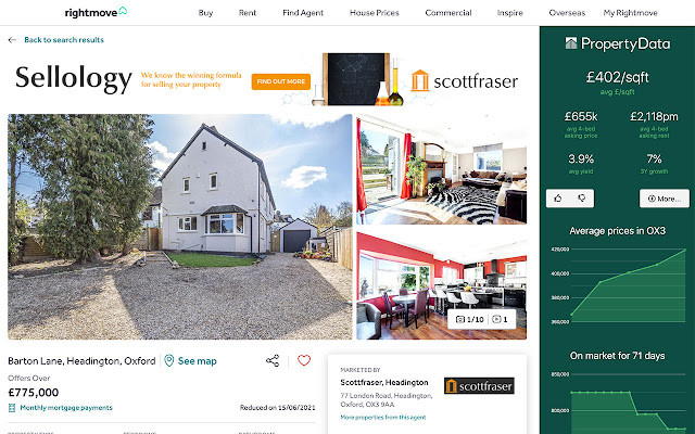 PropertyData Google Chrome 扩展程序在 Rightmove、Zoopla 和 OnTheMarket 列表页面上显示侧边栏。