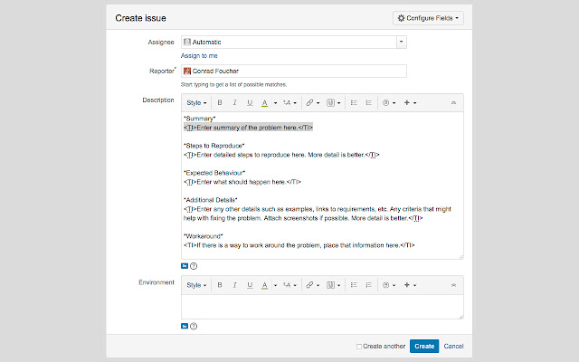 此扩展程序会自动将您选择的模板插入到 JIRA 创建问题描述字段中。注入的模板与 JIRA 上的“创建问题”模式中选定的“项目”和“问题类型”相关。
