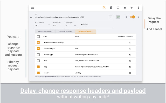 您无需离开浏览器就可以调整后端服务的 HTTP 响应负载。该扩展为您提供了基本和高级功能,可将数据提供给您的 Web 应用程序,并模拟或开发数据驱动的新功能。
