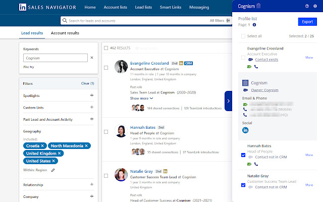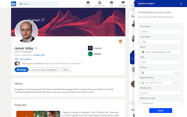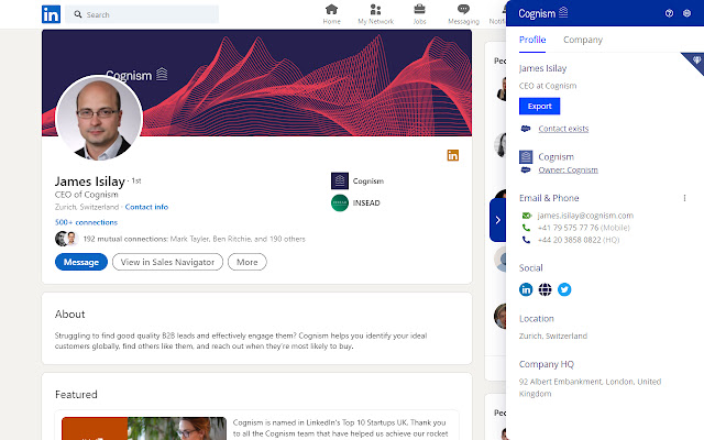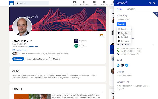 Cognism 的 Google Chrome 扩展程序为 Linkedin 和 SalesNavigator 提供 B2B 潜在客户数据,包括: