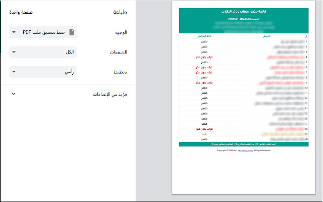 通过处理从Microsoft Teams程序Microsotf Teams中提取的出勤表文件的数据,增加男女教师的帮助,便于跟踪和监控Madrasati平台中男女学生的缺勤和迟到情况,及其功能还包括打印缺勤报告,一切都轻松自如。