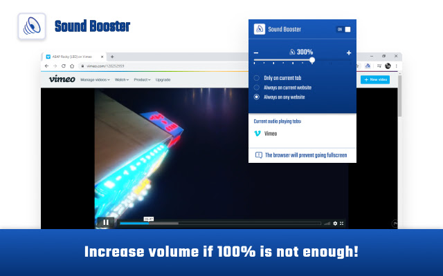 With Sound Booster you can Increase volume above maximum for all audio/video in the browser.