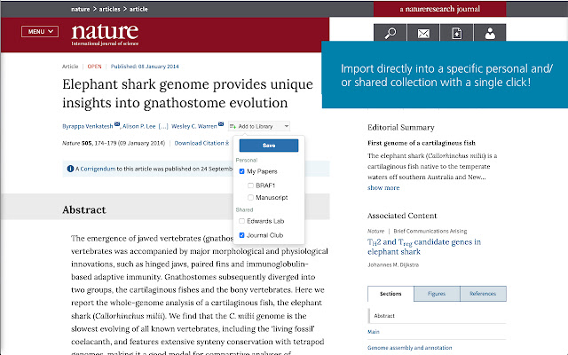 专为 ReadCube Papers、Enterprise 和 Anywhere Access 客户而设计,新的 ReadCube Papers 浏览器扩展增强了您研究生命周期中的工作流程:从搜索和导航到全文,到保持井井有条、阅读和注释、与同事共享和协作,以及最后引用论文并在手稿中生成参考书目。