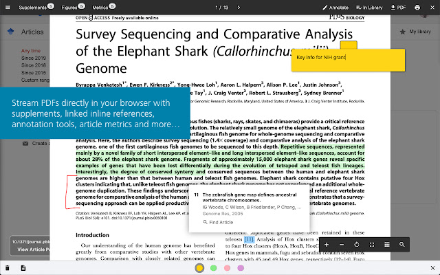 • 像往常一样在网络上查找论文,包括 PubMed、Google Scholar、Dimensions、BioRxiv 和大多数期刊网站等发现站点。我们的扩展程序可以立即识别论文是否在个人或共享图书馆馆藏中以便即时访问。不再需要多次下载同一份文件。