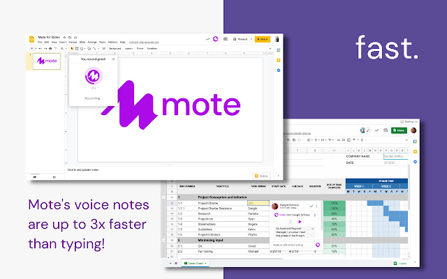 Mote 已集成到 Google 文档、幻灯片、表格、表单、课堂和 Gmail 中 - 便于录制和播放。