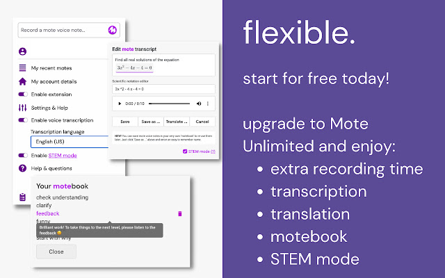 将语音到文本转录添加到您的语音笔记中 - 只需单击浏览器窗口中的 Mote 图标即可访问菜单 - 并从 20 多种世界语言中进行选择以进行转录。*