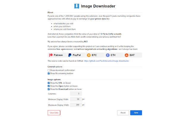为了从网页中提取图像,Image Downloader 需要能够在您打开弹出窗口时读取该网页上的所有内容。没有数据离开您的计算机。有关更多详细信息,请查看我们的隐私政策:https://pactinteractive.github.io/image-downloader
