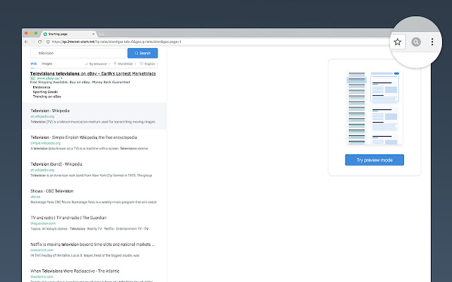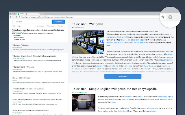 Internet-Start 扩展程序将替换您当前的搜索并将搜索查询的结果转换为方便的格式:搜索结果列表中的网站在右侧打开,无需点击或点击链接。