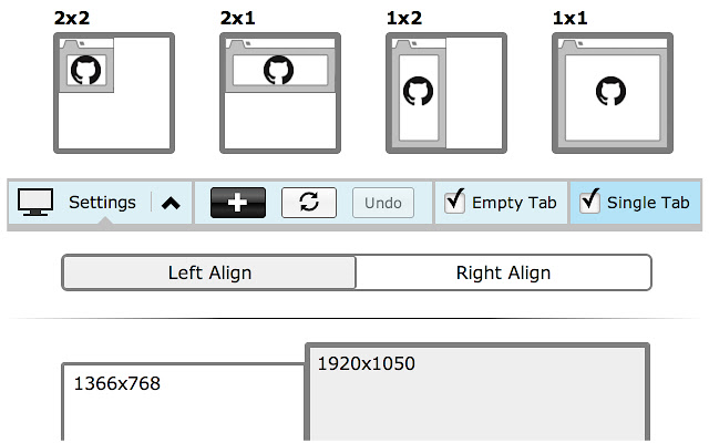 ✓ 一个简单的扩展,旨在让您轻松调整选项卡的大小。提供了一组默认布局,但您可以在布局列表中添加和删除以满足您的需要。借助多显示器支持,您可以轻松地将窗口从一个屏幕移动到下一个屏幕。
