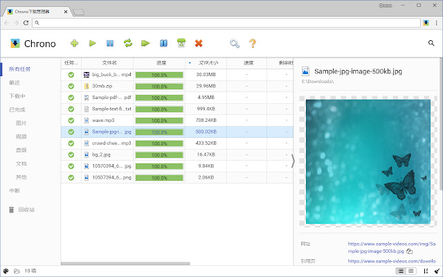 * Chrono使用Chrome™自带的下载模块进行下载,所以功能上会受到该模块的限制。比如,当浏览器关闭、重启后,你无法继续上次的下载;你无法为下载任务选择任意的存储位置,它们只能存储到Chrome™默认下载位置或其子目录下。