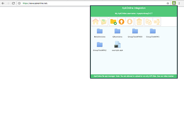 这个扩展是一个管理器,用于为 ApkOnline 提供的 android 在线模拟器处理 APK。 它允许用户上传可以在不同文件夹中分组、重命名、复制、删除甚至使用 API 与 ApkOnline 集成执行的 APK。