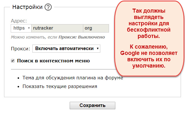 Chromium 为开发人员提供了极其原始的功能——只有最后安装的一个插件才能控制必要的浏览器设置。此扩展的一个功能是无冲突操作模式(“代理:自动启用”选项)。在这种模式下,您可以毫无问题地使用任何其他类似的插件**。唯一的条件是这个插件必须最后安装。如果不是这种情况,则会向您提供有关如何解决冲突的说明(您只需要重新安装插件)。