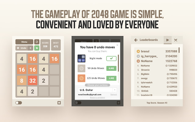 该扩展程序是弹出窗口中的原始2048益智游戏。在浏览器面板上可以访问它。 2048游戏还具有其他Mod,它是完全免费的!