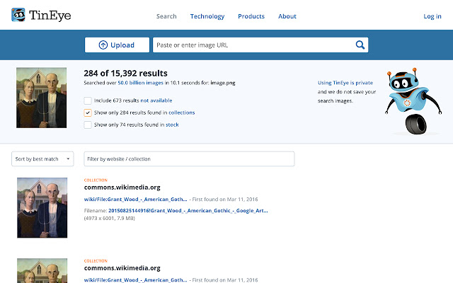 使用 TinEye 是私密的。我们不会跟踪您的搜索、保留您的图像或将它们添加到 TinEye 索引中。我们收集的唯一数据是您使用的扩展程序的版本。如需更多信息,请参阅我们的隐私政策:https://tineye.com/privacy