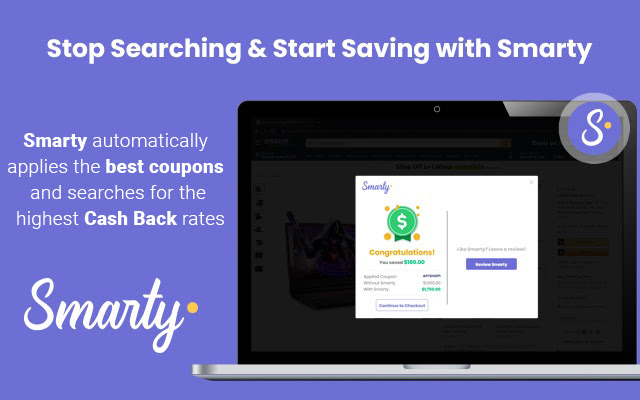 使用 Smarty 比较网络上的价格,并始终获得最优惠的价格。观看 Smarty 在结账时为您最喜欢的许多在线零售商应用最好的优惠券。购物时自动储蓄!