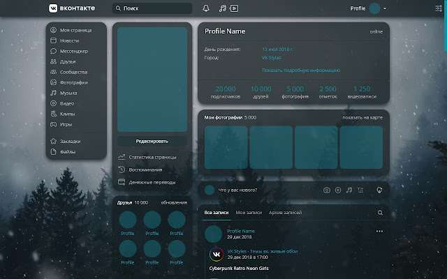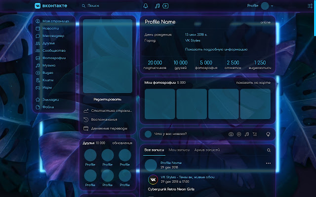 安装时,插件将 vk.com 的标准灯光设计更改为暗夜模式,然后您可以根据自己的喜好调整 VKontakte 风格,或者根据您的心情进行更改!!!