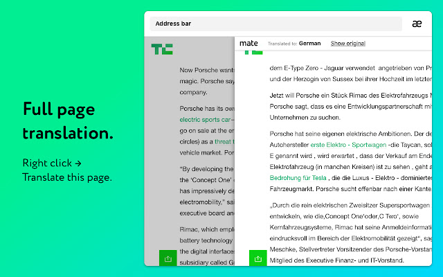 只要单击鼠标,Mate 就会为您翻译整个网页!在任何页面上,只要使用上下文菜单中的“翻译此页面”功能,就可立即翻译为您想要的语言。