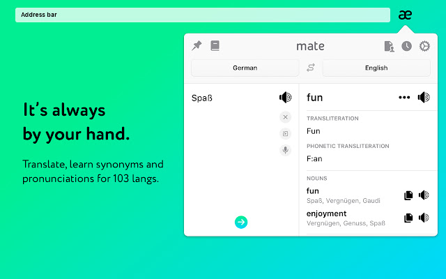 需要自行输入词句并翻译吗?您只需单击浏览器网址栏旁边的图标,即可开启 Mate 弹出窗口。在您需要时,它永远都在那里!