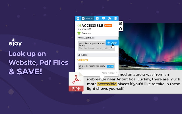 eJOY English还能帮您定义单字、英语成语、常用片语、最新俚语和搭配用词。