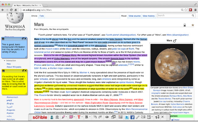 Scrible 工具栏扩展提供了注释、标记和共享在线文章和网页并将它们保存到您的 Scrible 帐户的最佳方式。扩展程序在地址栏的右侧放置了一个涂鸦按钮。浏览网页时,单击 按钮可在网页上加载涂鸦工具栏并用于: