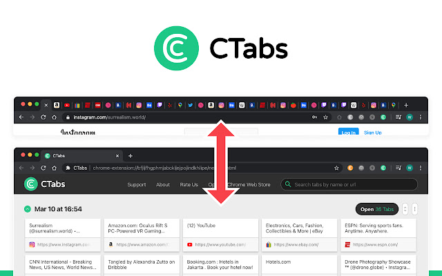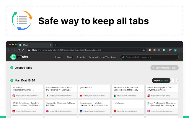 CopyTabs 扩展允许您整理浏览器,让您的网上冲浪体验更加舒适。将您打开的 Web 浏览器选项卡转换为列表,创建任意数量的列表,将您的选项卡分组保存,只需单击一下即可将它们编辑并恢复到单独的选项卡。