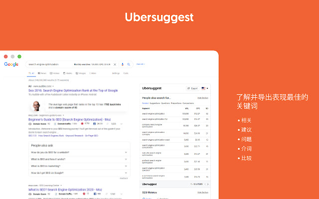 Ubersuggest是一款免费的Chrome扩展程序、强大的SEO工具,为您显示关键词每月搜索量、CPC以及竞争对手数据。