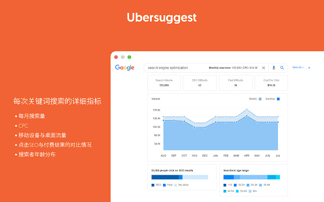 • Ubersuggest SEO扩展程序还提供图表与趋势!这些图表将细分总月搜索量,显示某个关键词的每月手机端搜索量与桌面搜索量。