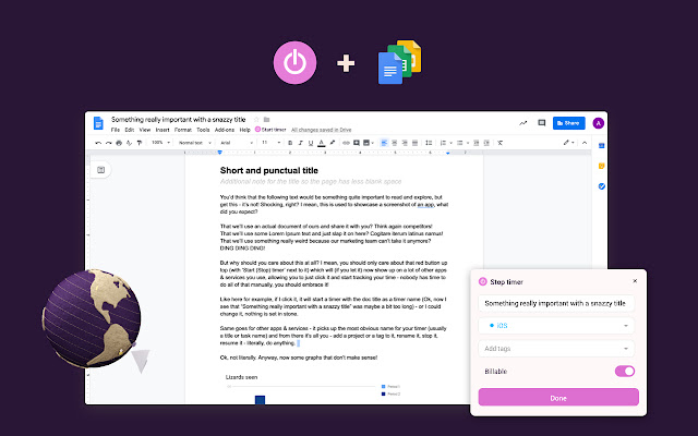 Toggl Track 是终极简单的在线计时器。无论您是需要跟踪您的工作、在线和离线活动的时间,还是只需要不时使用一个简单的秒表,将 Toggl Track 扩展程序添加到您的浏览器,您就会看到自己的好处。