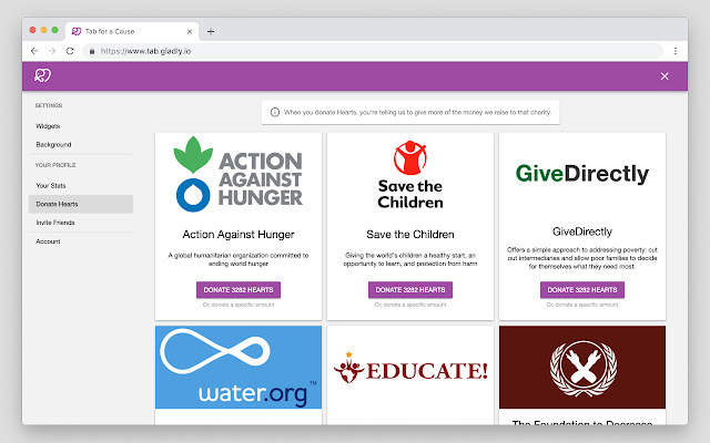 使用您在 Chrome 中打开的每个标签页为慈善事业筹款!只需上网冲浪,您就可以建造图书馆、植树、发送紧急援助、提供干净的水等等。选择您最喜欢的慈善机构来支持!