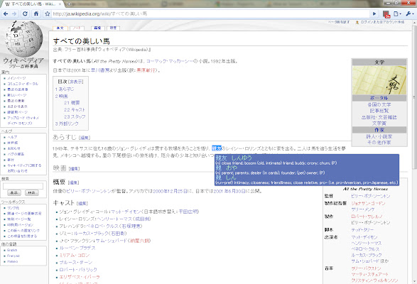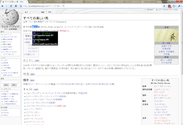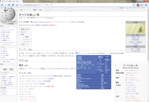 当它被激活时,当你将鼠标悬停在日语单词上时,它们会在弹出窗口中被翻译。如果您按 shift/enter,您将看到有关第一个汉字的一些信息。