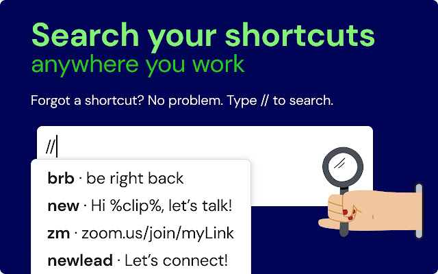 - 随处搜索:通过在您要扩展文本的任何站点中进行搜索,能够快速引用您保存的快捷方式