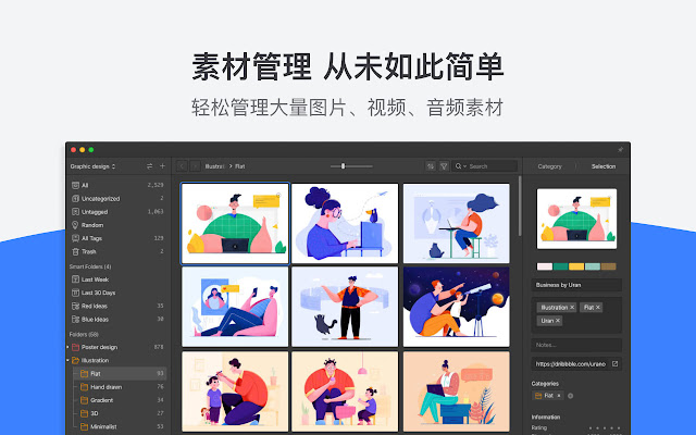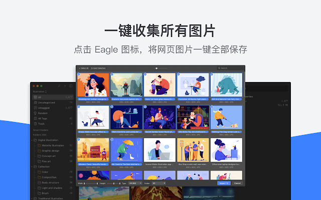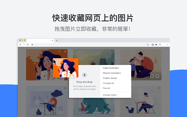 逛网站时看到感兴趣的图片就能立即收藏到 Eagle 里,并迅速完成分类整理。