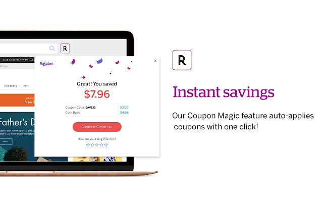 乐天(前身为 Ebates)按钮在参与的商店提供自动现金返还提醒。它是为您省钱的必备浏览器扩展程序。