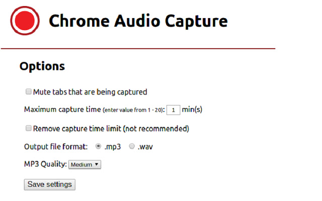 要在选项卡上开始录制,只需单击扩展图标并使用界面或热键开始和停止录制。录制停止或达到时间限制后,将打开一个新选项卡供您保存和命名音频文件。请确保在关闭选项卡之前保存您的文件,否则文件将丢失!检查选项页面以了解不同的输出文件格式和其他功能!
