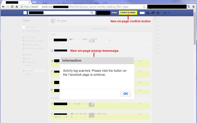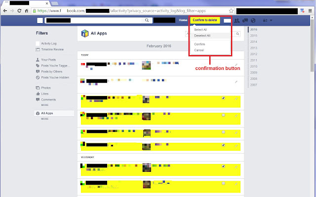 6. pscan 过程完成后,Facebook (TM) 页面顶部将显示一个确认按钮。您可以根据需要验证并取消选中某些帖子,然后继续实际删除这些帖子。
