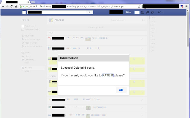 4. 点击“删除帖子”按钮。该扩展程序将扫描您的活动日志并删除所有符合条件的帖子。