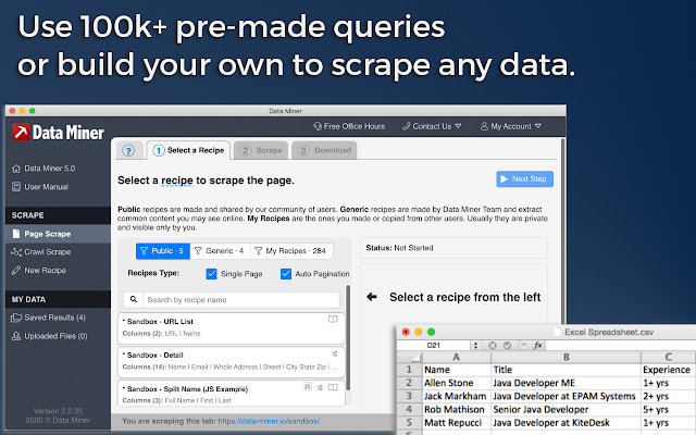 DataMiner Scraper 是一种数据提取工具,可让您抓取任何 HTML 网页。您可以从任何页面提取表格和列表并将它们上传到 Google 表格或 Microsoft Excel。使用 Scraper,您可以将网页导出为 XLS、CSV、XLSX 或 TSV 文件(.xls .csv .xlsx .tsv)