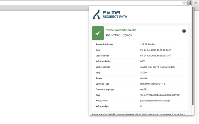 除了标记重定向和错误外,该插件还可以通过单击按钮显示其他 HTTP 标头(例如服务器类型和缓存标头)和服务器 IP 地址。