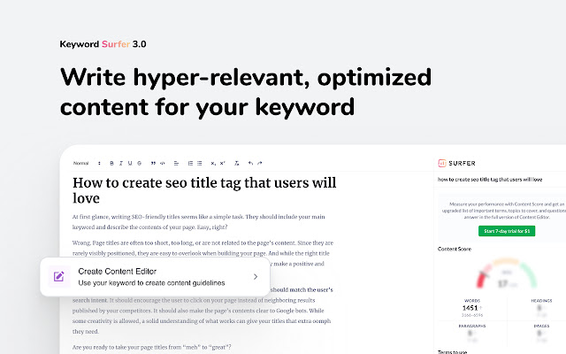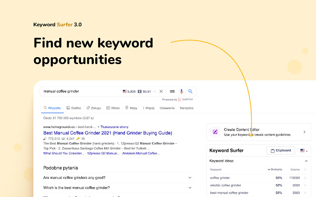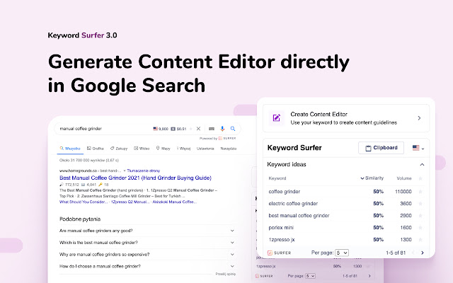 使用 Keyword Surfer,只需点击两次鼠标即可获得全面的关键字研究和数据驱动的内容指南。