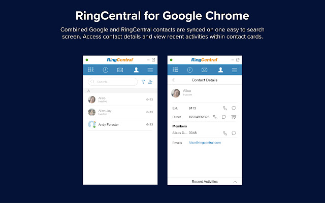 - 将您的 RingCentral 和 Google 联系人合并到一个易于搜索的屏幕中