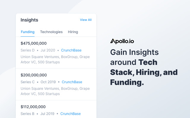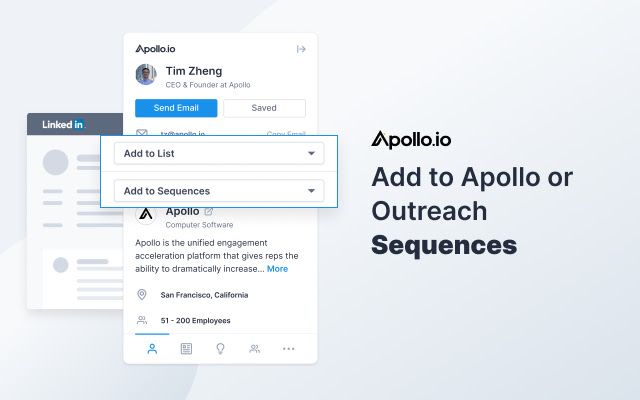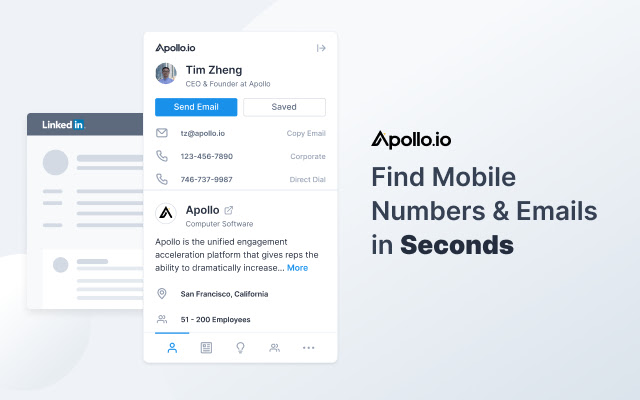 使用 Apollo for Chrome,只需单击一下,您就可以从 LinkedIn 和公司网站上找到电子邮件地址和手机号码等联系方式。除了联系信息外,您还可以获得有助于您的会议的额外研究。