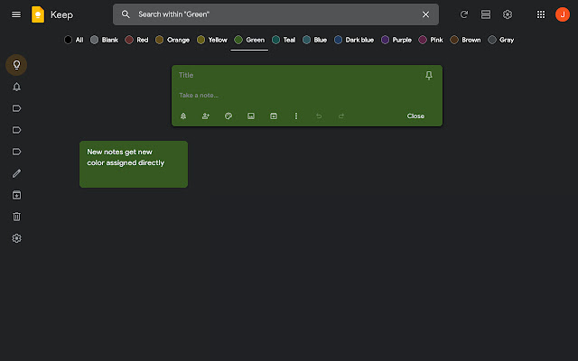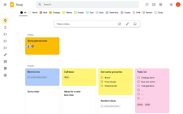使用 Google Keep™ 的类别标签,您现在可以按类别对新的和现有的笔记进行排序。每个类别代表一种颜色。将笔记添加到类别非常容易,只需更改笔记的颜色即可。当您要查看按颜色排序的笔记时,只需单击要查看的笔记颜色即可。如果您想查看整个笔记/清单集合,颜色选项旁边有一个“全部”选项(默认设置此选项)。